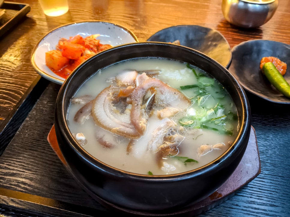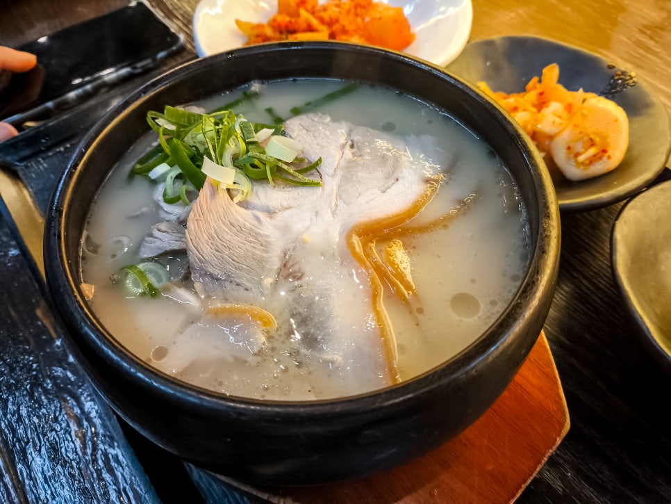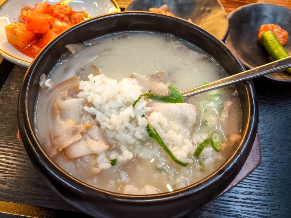 굉장히 뽀얀 국물의 국밥이다. 머릿고기가 올려져 있다.