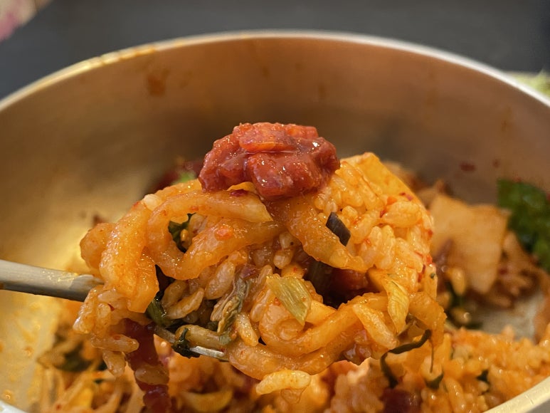 조심스럽게 비벼 한입 먹었을 때,